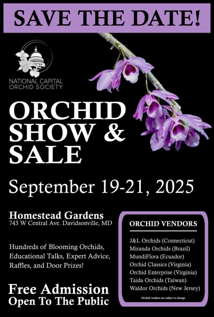 SAVE THE DATE! The 2025 National Capital Orchid Society Annual Show & Sale will take place on September 19-21, 2025 at Homestead Gardens in Davidsonville, Maryland!This year’s show is BIGGER AND BETTER featuring educational orchid talks and a fantastic lineup of national and international vendors!Check out this year’s lineup of vendors:Miranda OrchidsJ&L OrchidsWaldor OrchidsMundiflora farmOrchid ClassicsTaida Orchids Inc.Orchid Enterprise Inc.100% FREE ADMISSION & OPEN TO THE PUBLIC!Show hours:Friday, September 19: 12:00 PM – 5:00 PMSaturday, September 20: 10:00 AM – 5:00 PMSunday, September 21: 10:00 AM – 3:00 PMWhether you’re a seasoned grower or just discovering the magic of orchids, this is an event you won’t want to miss!